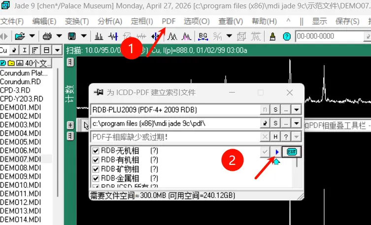 然后点击PD菜单-索引,然后点击标记为2的蓝色箭头开始索引