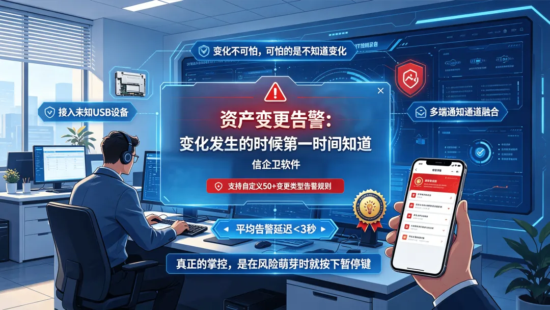 信企卫的资产变更告警功能,能在设备状态或配置发生变化时及时推送通知。硬件变动、软件安装、设备异常离线,都可以设置对应的告警规则。这个功能的价值不只是信息及时,更重要的是把"事后发现"变成了"事中知情",管理员有机会在问题扩大之前介入处理。