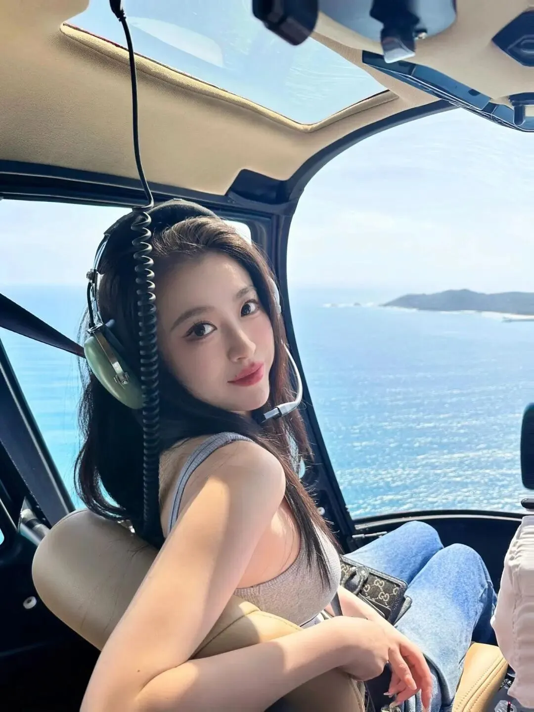 如果有机会去海边或者体验直升机项目,千万别只拍呆板的合影。在直升机里或者海边堤坝上,风是天然的造型师。穿上简单的吊带搭配牛仔裤,露出锁骨和手臂线条,清爽又减龄。不要摆拍,让朋友开启连拍模式,你只需要转头、撩发、大笑。头发被风吹乱的瞬间最有生命力,眼神要坚定自信,看向地平线或者大海深处。这种照片传递的是一种自由和洒脱,不需要精致的表情管理,那种活力十足的状态,比任何精修图都打动人,苗条显身材的效果也是一绝。