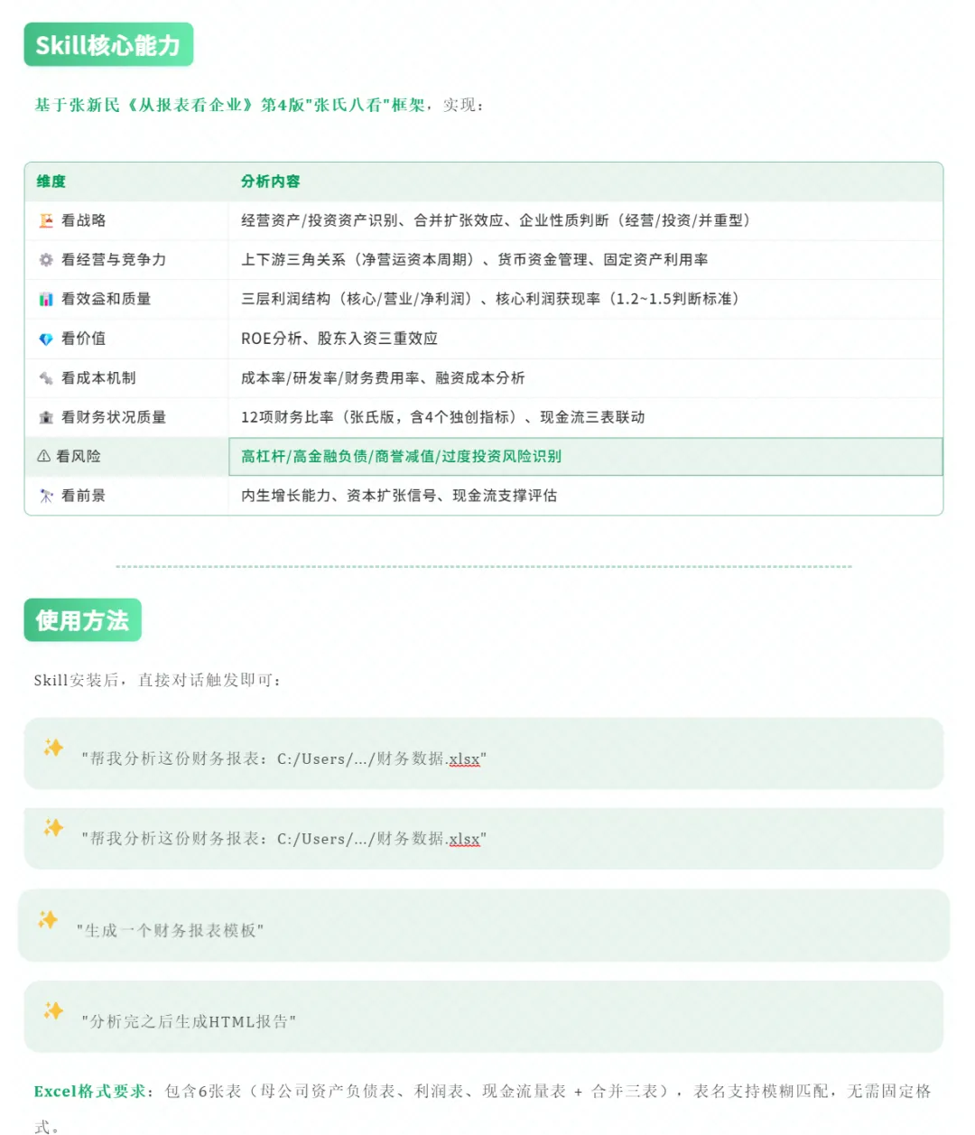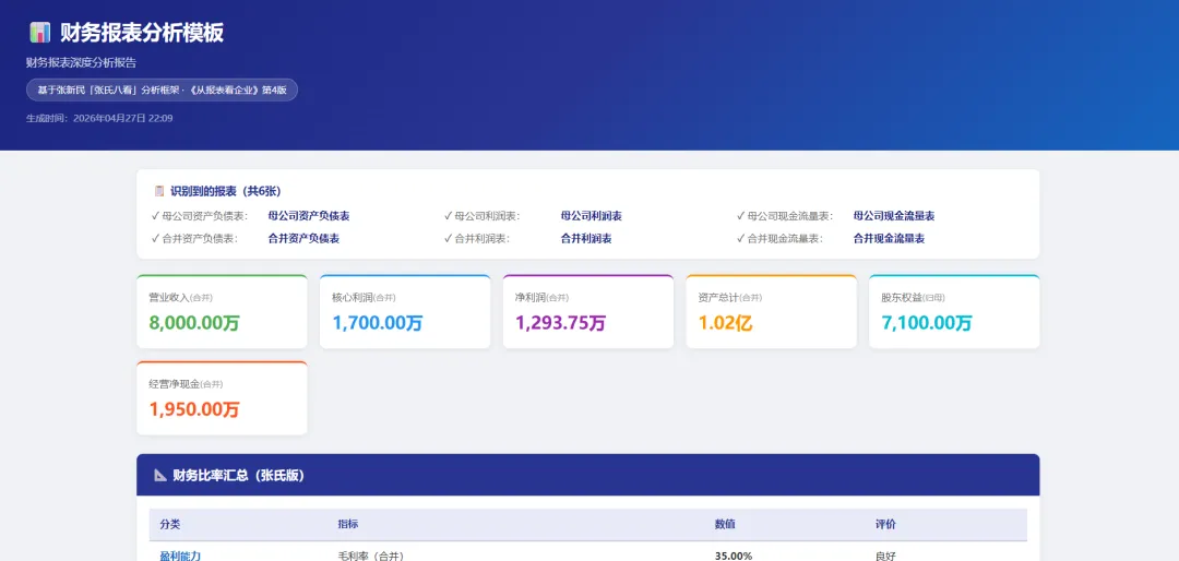 当年的模板,现在的Skill当年考会计师,是在Mooc上看了张新民老师的课程考过的,今天呢,基于张新民老师的《从报表看企业数字背后的秘密(第4版)》做了一个财报分析的skill。1. 老子当年辛辛苦苦学了那么久,AI来了分分钟就给秒了?2. 把这个skill当做当年工作中的模板是不是心里会好受些