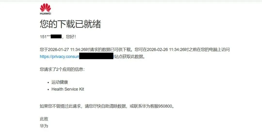 提交申请后,通常需要最多等待7天进行审核和处理,完成后邮件会收到包含所有运动数据副本的下载链接。登录网页上的华为“隐私中心”后,通过验证,可获得一个结构化的数据包,里面包含完整运动历史记录,有跑步、骑行、游泳等全部数据,可以向第三方平台迁移。