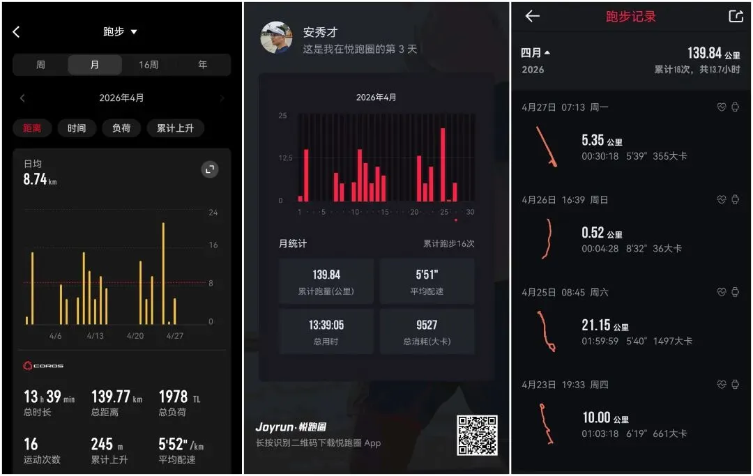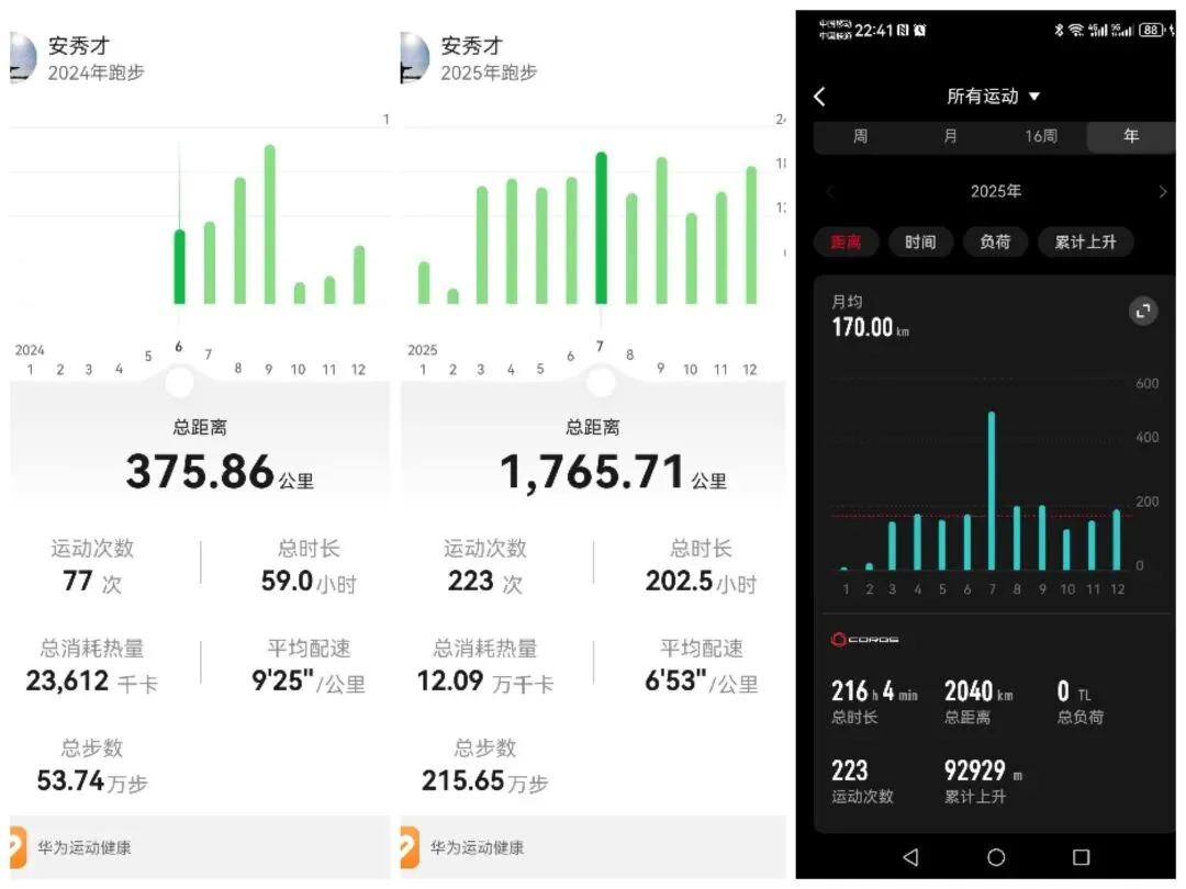 秀才跑步一年多,用华为手机运动健康记录跑步数据,累计跑量达到了2000多公里,参加过一次全程马拉松,三次半程马拉松。
