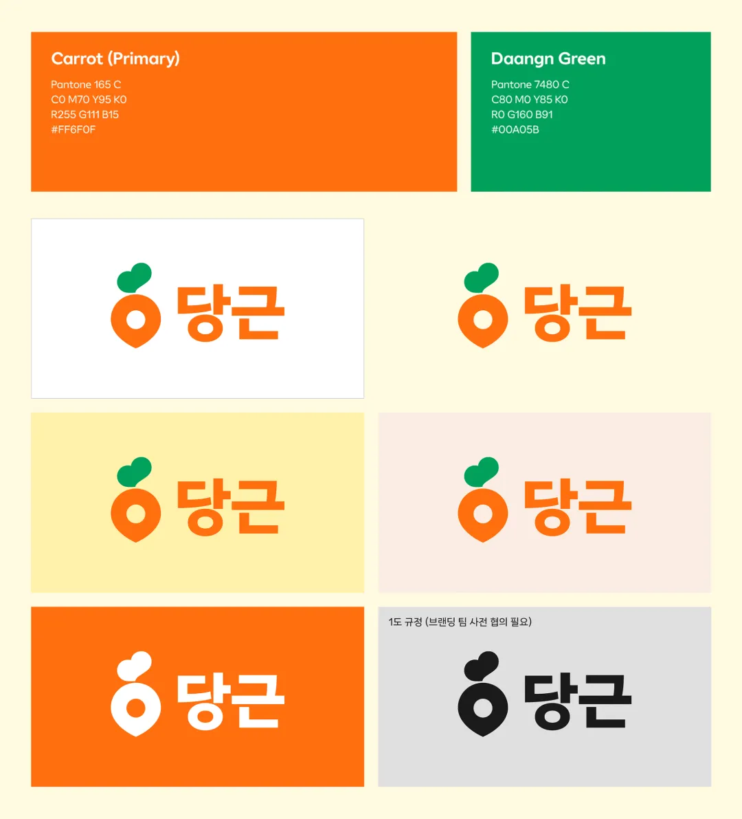在颜色方面,他们的核心颜色使用了的橙色调(Daangn Orange),给人一种温暖、活泼、亲切的感觉。相比于其他交易平台可能带来的“冰冷生意感”,Karrot 的 Logo 传达的是一种“邻里间的互助”和“温情”。