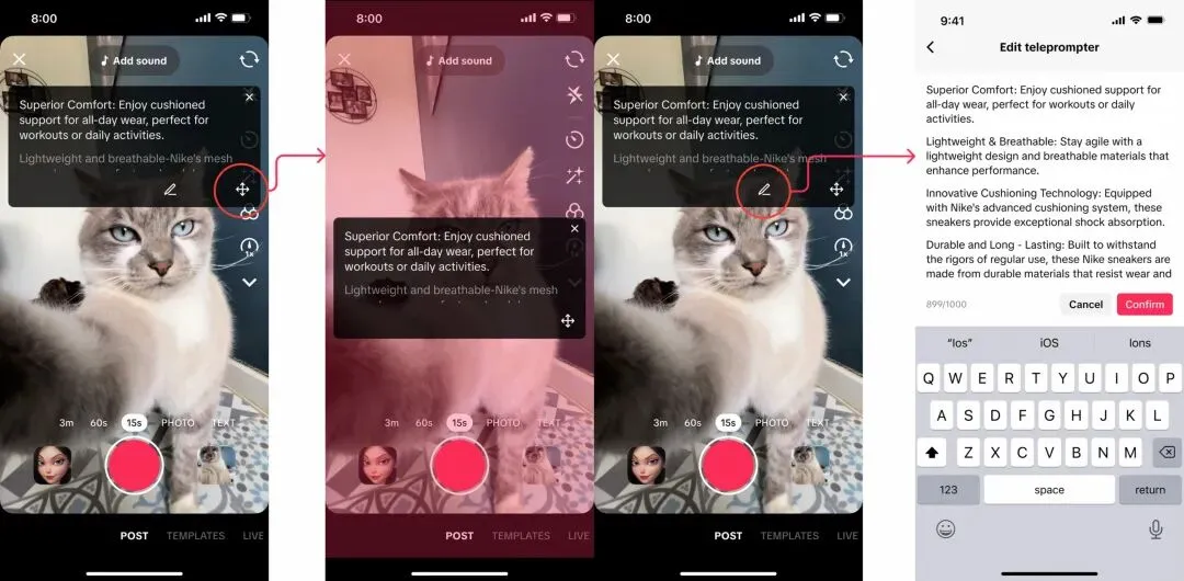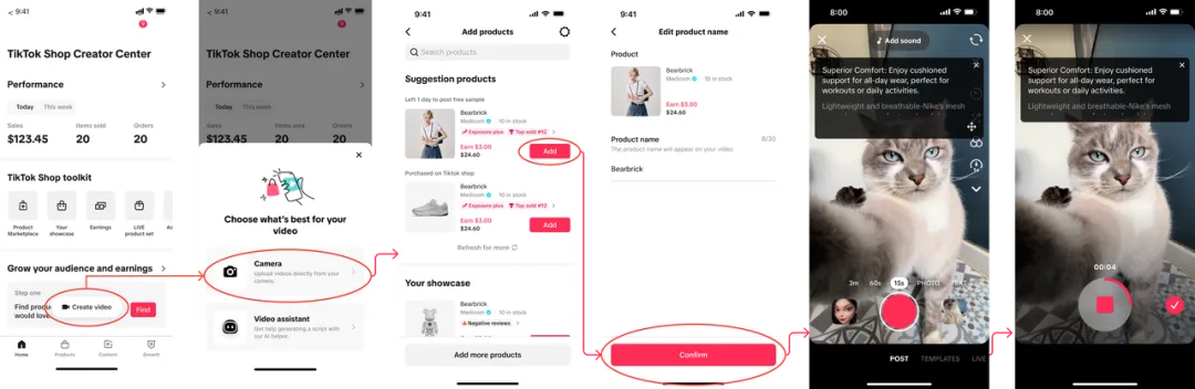 STEP1️⃣:从上面的入口进入后,点 “创作”→ 选 “相机”,然后把产品链接到视频里STEP2️⃣:关联成功后点 “确认”,提词器会自动弹出来,上面就是 AI 生成的产品卖点STEP3️⃣:按住 “录制” 按钮开始拍,卖点会自动往上滚;也可手动滚动提词器内容,自行查看其他支持: