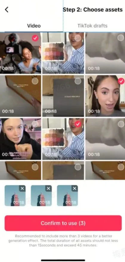 STEP3️⃣【上传素材】:可以从相册传以前拍的视频,也能直接用相机新拍注意:为获得最佳的视频生成效果,建议传5个以上素材(单个视频不超过100MB),总时长超过15分钟,多拍几个产品角度,上传的素材最少15s