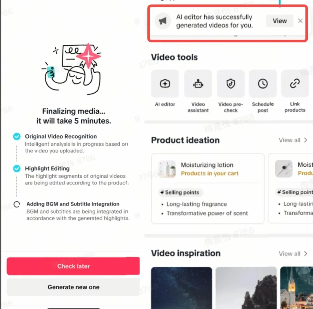在 AI creative studio 页面能看到所有视频的生成状态,素材越长、越多样,出高质量视频的概率越高如果AI生成的视频失败,可以点击“重新生成”再次生成视频生成后,可以直接播放、导出或者发布对应视频,但暂不支持编辑或重新生成已经生成的视频