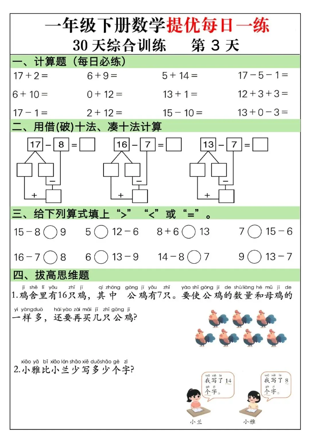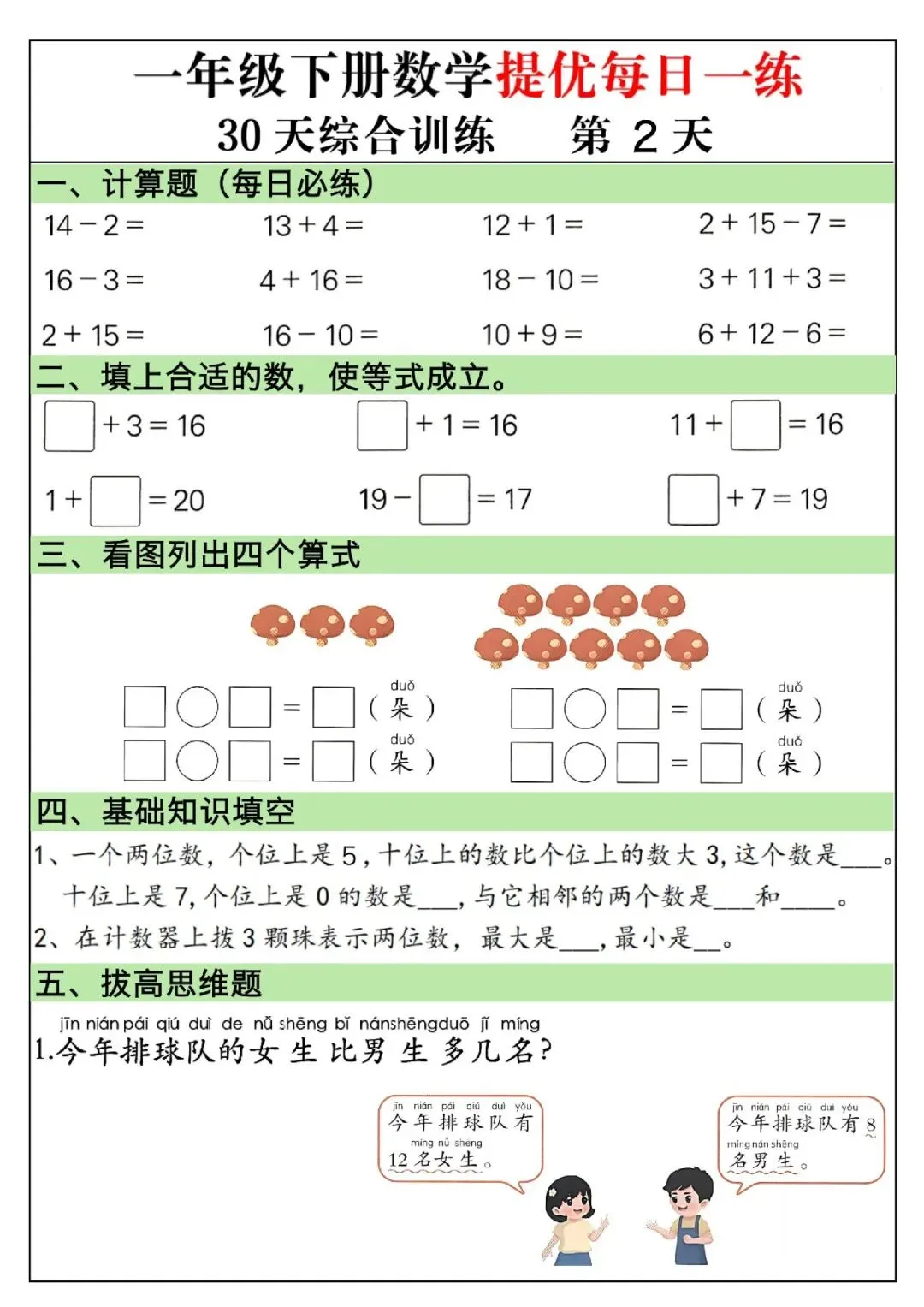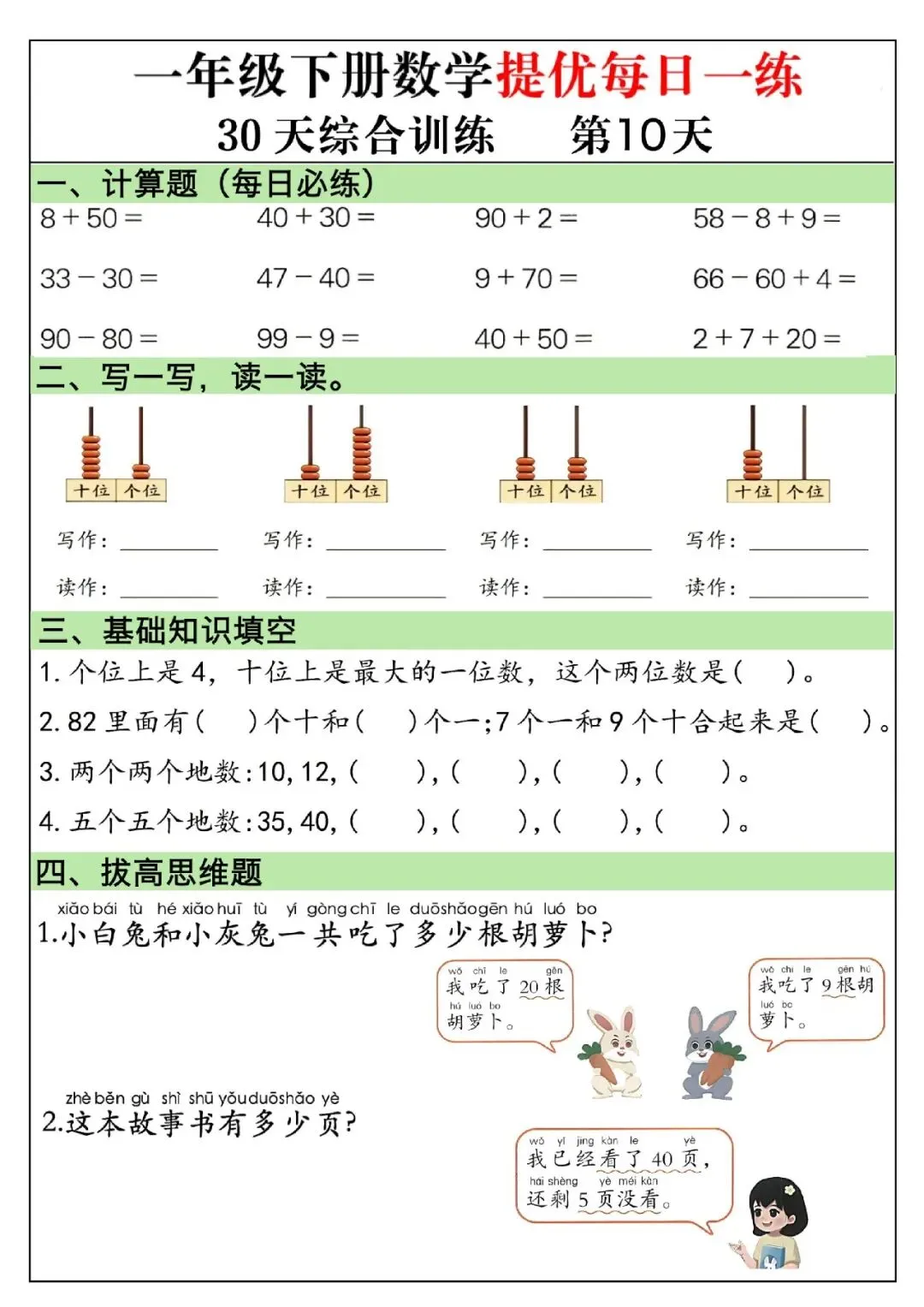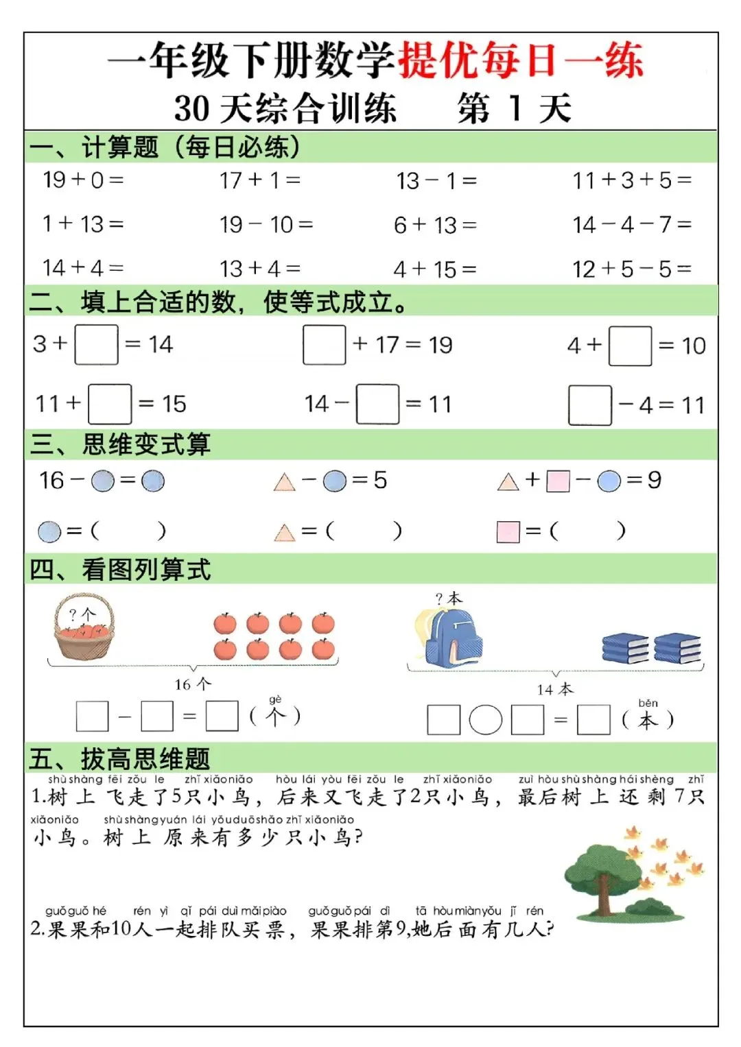 一年级下册数学题可打印(计算题+看图列式+比多少+应用题+思维题)专项训练每日一练大家好,这里是淘学学资料库,这份《一年级下册数学提优每日一练》,完整 pdf 电子档共 30 页。这份资料为 30 天系统化综合训练,每天设置口算计算、等式填空、思维变式、图形计数、看图列式、拔高应用题等模块,全面覆盖 100 以内加减法、凑十破十法、数的组成、找规律、元角分、百数表等课本核心知识点,题型丰富且紧贴考点。这份练习按天梯度编排,由基础巩固逐步过渡到提优拓展,融入大量易错变式题与思维拓展题,兼顾计算速度提升与逻辑思维训练,涵盖排队、年龄、还原、移多补少等高频应用题类型,配有清晰解题思路,适合孩子每日打卡练习,既能夯实计算基础,又能强化解题技巧,是课后提升、期中期末复习与冲刺培优的优质数学资料。(公众号底部菜单查看完整pdf获取方式)01截图预览(因篇幅有限,仅展示部分内容)02文件目录一年级下册数学提优每日一练.PDF (30页)03获取方式公众号底部菜单查看完整pdf获取方式END