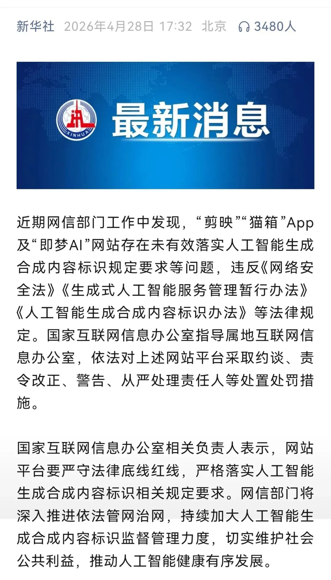 近期网信部门工作中发现,“剪映”“猫箱”App及“即梦AI”网站存在未有效落实人工智能生成合成内容标识规定要求等问题,违反《网络安全法》《生成式人工智能服务管理暂行办法》《人工智能生成合成内容标识办法》等法律规定。