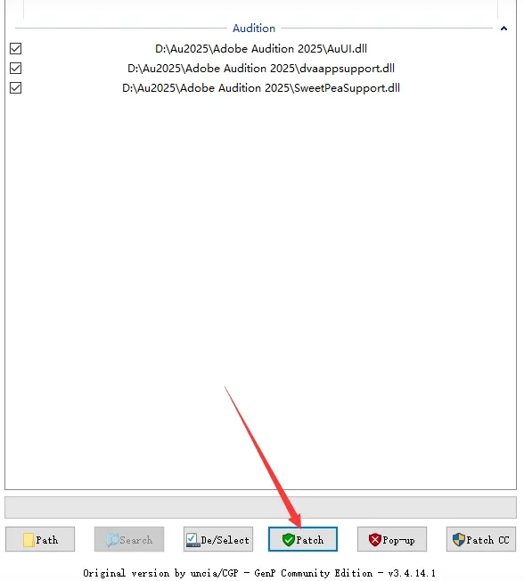 13. 开始激活:点击“Path”,在弹出的对话框中找到软件安装目录(步骤四和步骤六中所更改的位置)下的“Adobe Audition 2025”文件夹并打开。