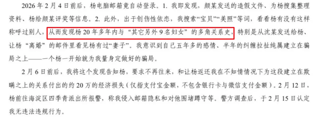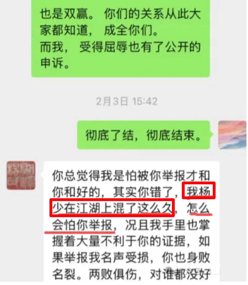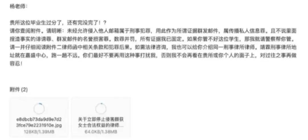 2026年2月3日,颜教授给杨教授甩过去一句话:“你管不好你的学生,我就请警察帮你管。你们别再用这种事打扰我,再看谁的面子,我也不忍了。”