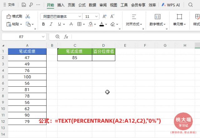 语法:=PERCENTRANK(数据区域,数值,[小数位数])