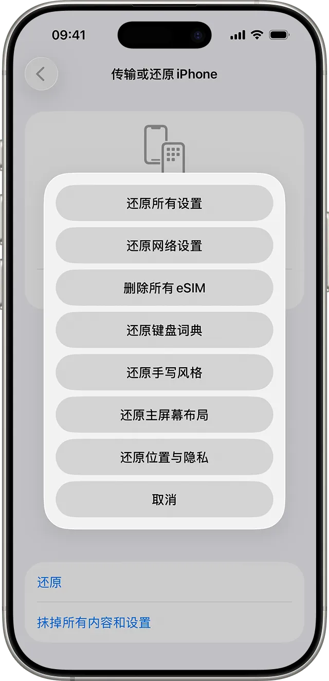 路径:设置 > 通用 > 传输或还原 iPhone > 重置 > 重置网络设置。