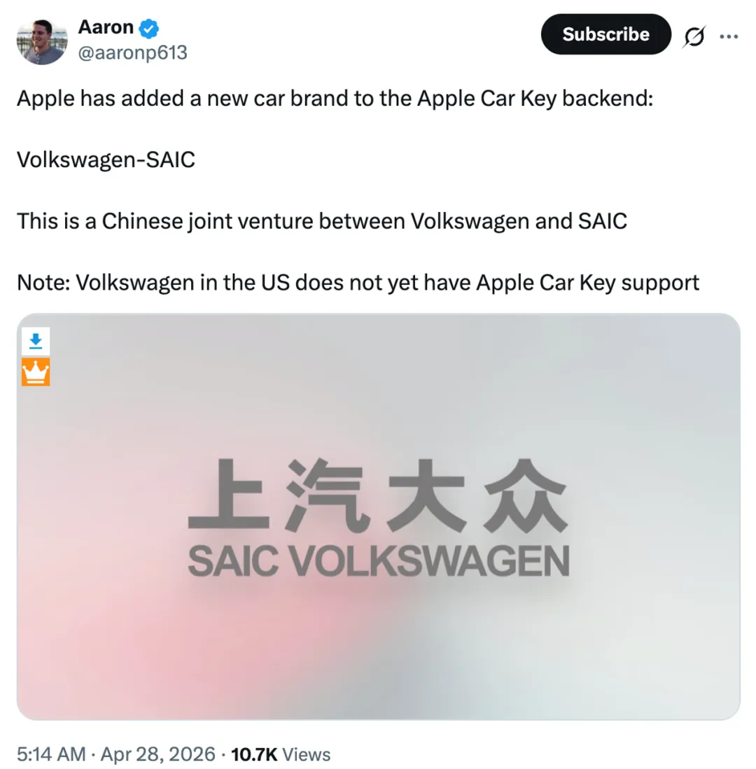 还有一个偏生态的变化,是 iPhone 数字车钥匙,iOS 26.5 Beta 4 里被发现了和上汽大众有关的品牌标识,这意味着后续部分车型可能会接入苹果车钥匙功能,真要落地以后,用户把车钥匙绑定到钱包里,用 iPhone 或 Apple Watch 靠近车辆,就能完成解锁