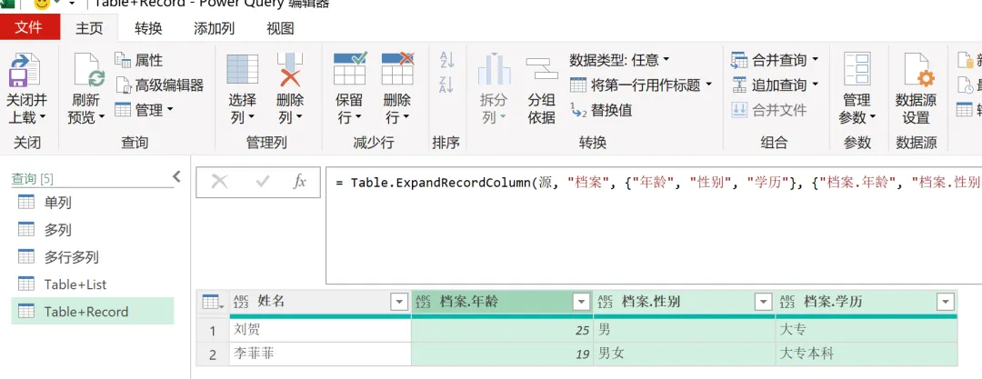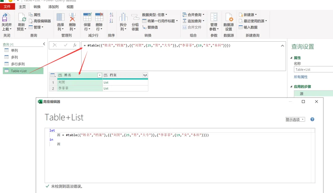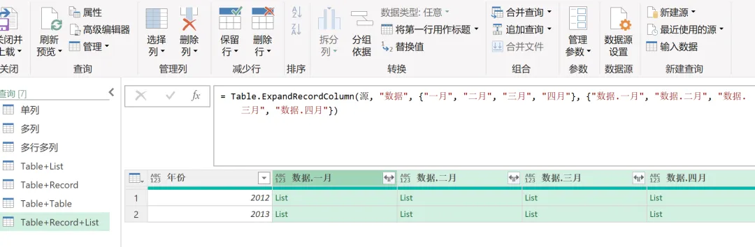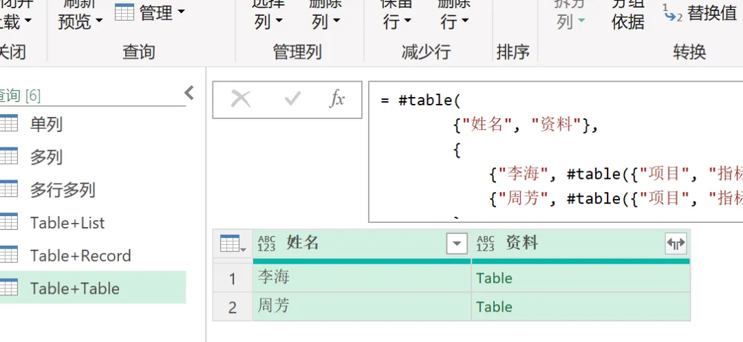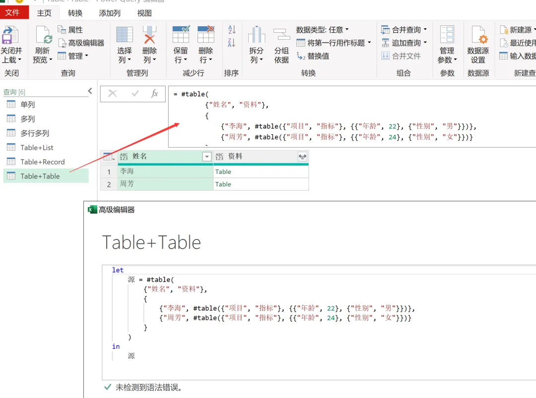 EXCEL|Power Query的结构组成之创建table表创建table表包括以下3种形式。1)创建单值表格,点击高级编辑,语句如下:2)创建多列表格,语句和结果如下:3)创建多行多列表格,语句和结果如下图所示。以上三种是最基本的创建table表格的方式。无嵌套的table表格,都可以用以上方式创建。需要特别注意的是:所有文字之外的标点符号都需要是英文半角下的,所以要熟练中英文间的自由切换,不然就是不停的报错报错报错,十分痛苦。下面咱们介绍创建多层嵌套table表的4种形式。01)创建Table+List, 公式和结果如下图所示。里面用到的基本都是大括号{}。扩展后如下图所示:02)创建Table+Record,公式和结果如下图所示。里面用到了中括号[].扩展后结果如下图所示。以上2个案例,可以直接看出加行Record和加列List,用到的符号是不一样的。这个咱们上一节经过,点这里。EXCEL|Power Query的结构组成之创建List列表。03) 创建Table+Table,公式如下图所示。展开效果如下图所示。04)创建Table+Record+List(多层嵌套),如下图所示公式。这个比较复杂点,但是只要一层层拆开,就还挺好理解的。都展开后的结果如下图所示。这些语句看着一堆,但是多写几次,就基本能看出个所以然,然后就逐渐会用了。所以,为了避免眼高手低,咱们还是要多写写。照着写写,再背着写写,加上平时工作中的应用,就会逐渐熟练了。好了,今天内容就这些。