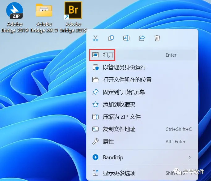 8、回到桌面,右键桌面上的【Adobe Bridge 2019软件图标】,点击【打开】