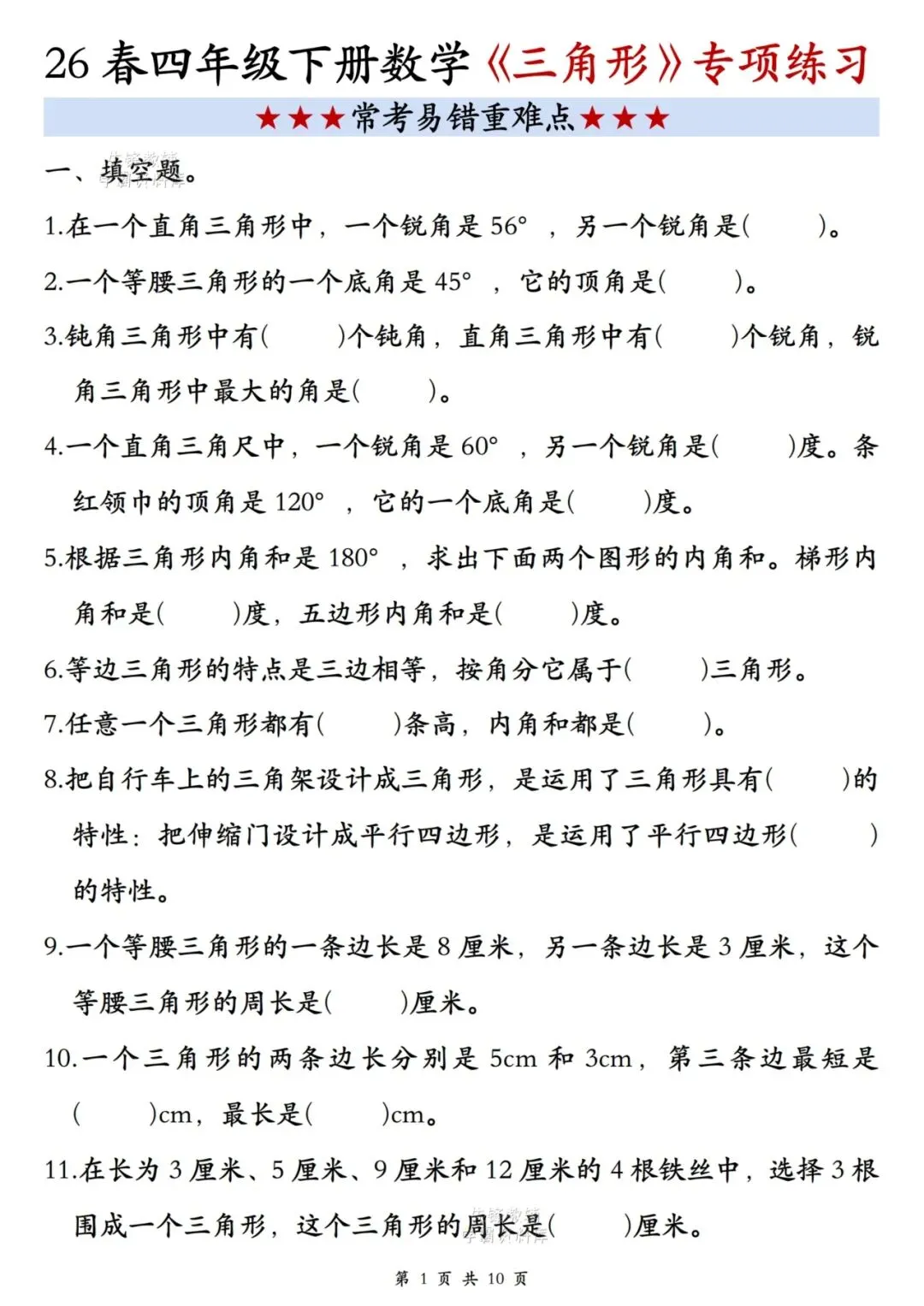 别慌!今天给大家整理了这份四年级下册数学《三角形》专项练习,把三角形的核心考点、易错点都整理好了,帮娃彻底攻克这个重难点!