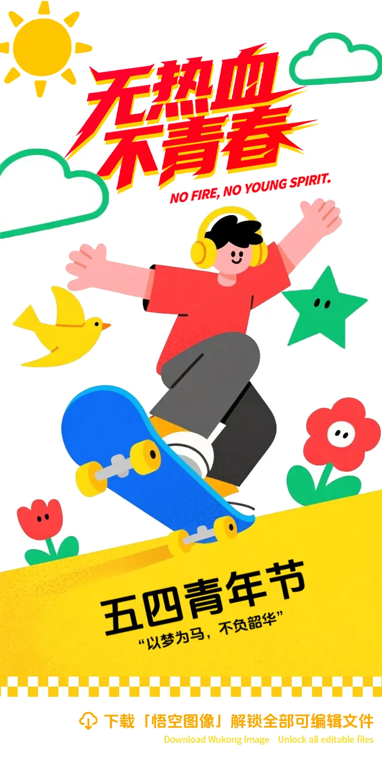 即刻打开悟空图像,选好海报模板,以青春之名,致敬时代,致敬每一位奋勇向前的中国青年!