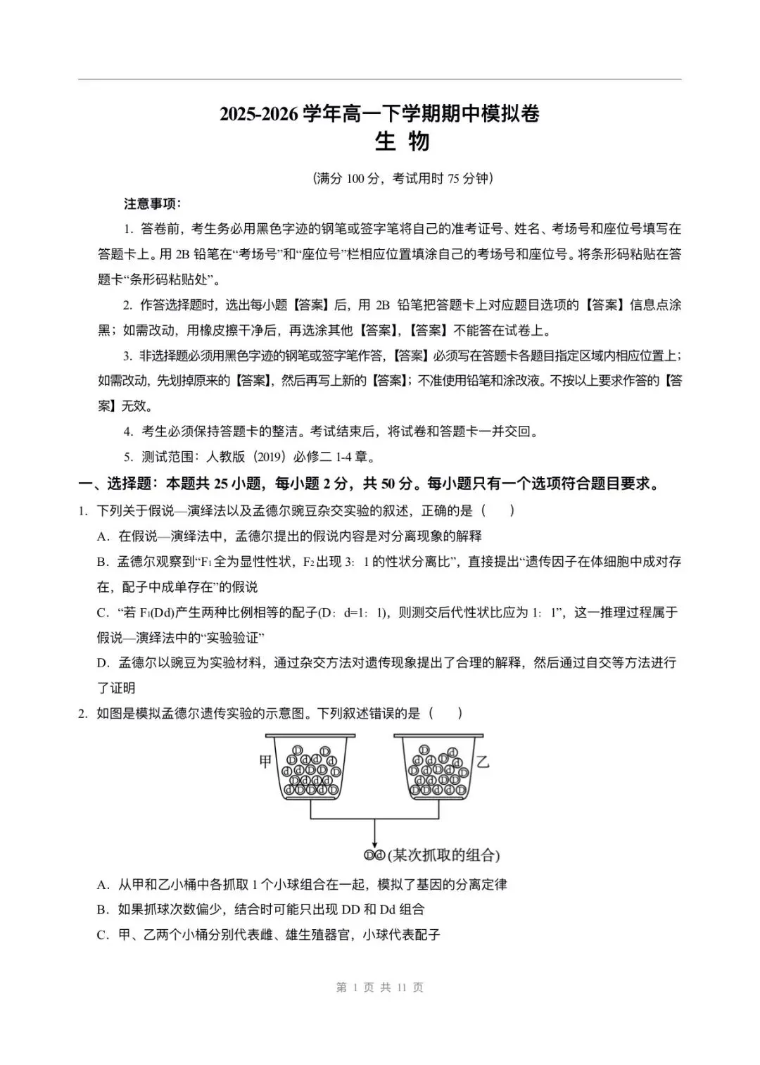 2026新版高一下册必修二生物(人教A版)期中试卷共六套,电子版可打印!