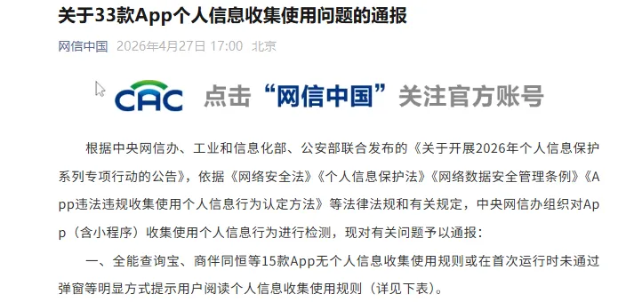 根据中央网信办、工业和信息化部、公安部联合发布的《关于开展2026年个人信息保护系列专项行动的公告》,依据《网络安全法》《个人信息保护法》《网络数据安全管理条例》《App违法违规收集使用个人信息行为认定方法》等法律法规和有关规定,中央网信办组织对App(含小程序)收集使用个人信息行为进行检测,现对有关问题予以通报: