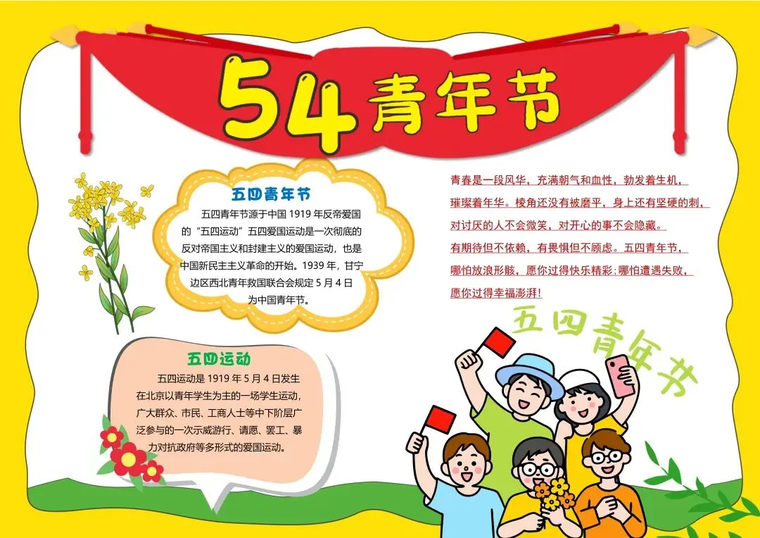 小编特意为莘莘学子整理了一整套五四青年节主题的手抄报,有彩色带文字和不带文字版以及黑白线稿,都是可以直接打印的,就连文稿也为大家备好,请大家根据需要下载即可!