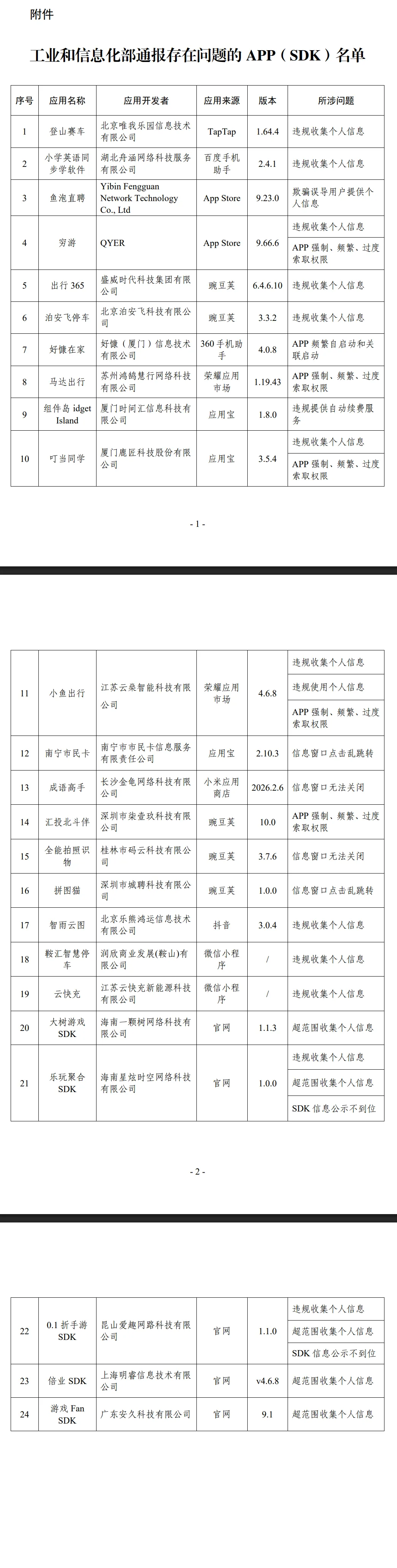 附件:工业和信息化部通报存在问题的APP(SDK)名单