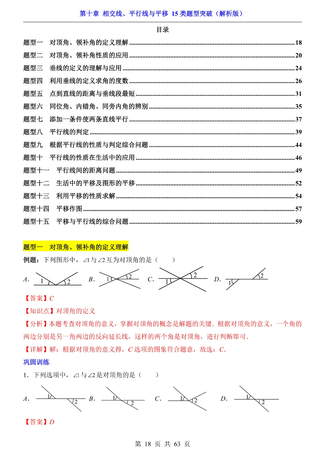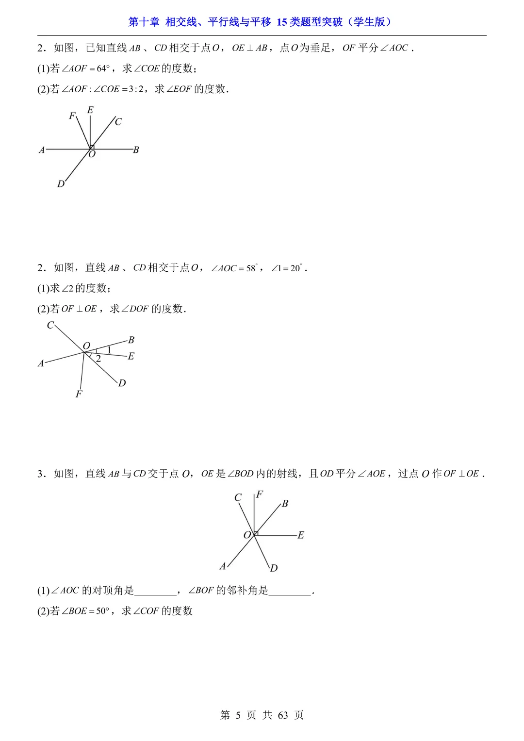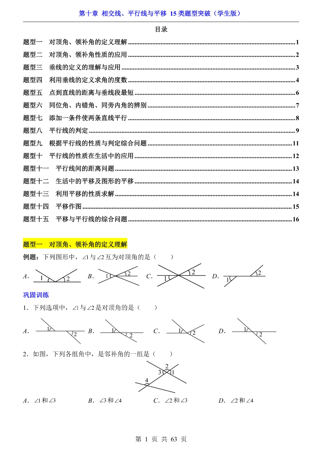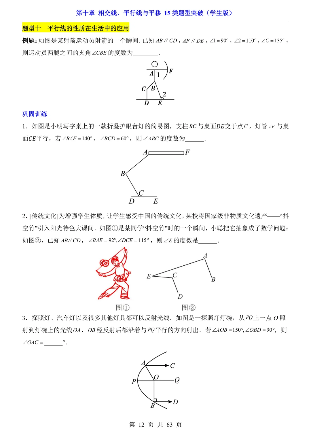 今天给大家分享的是:【七年级下册数学】【沪科版】第10章相交线、平行线与平移十五大类题型突破附带答案|完整高清电子版可打印
