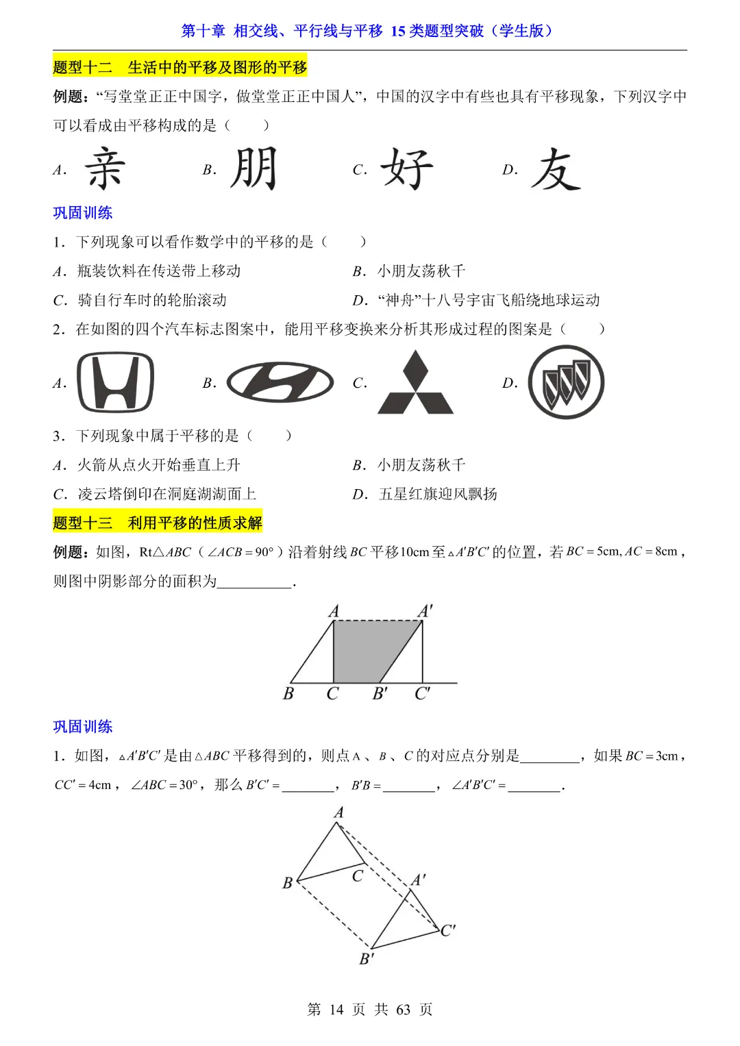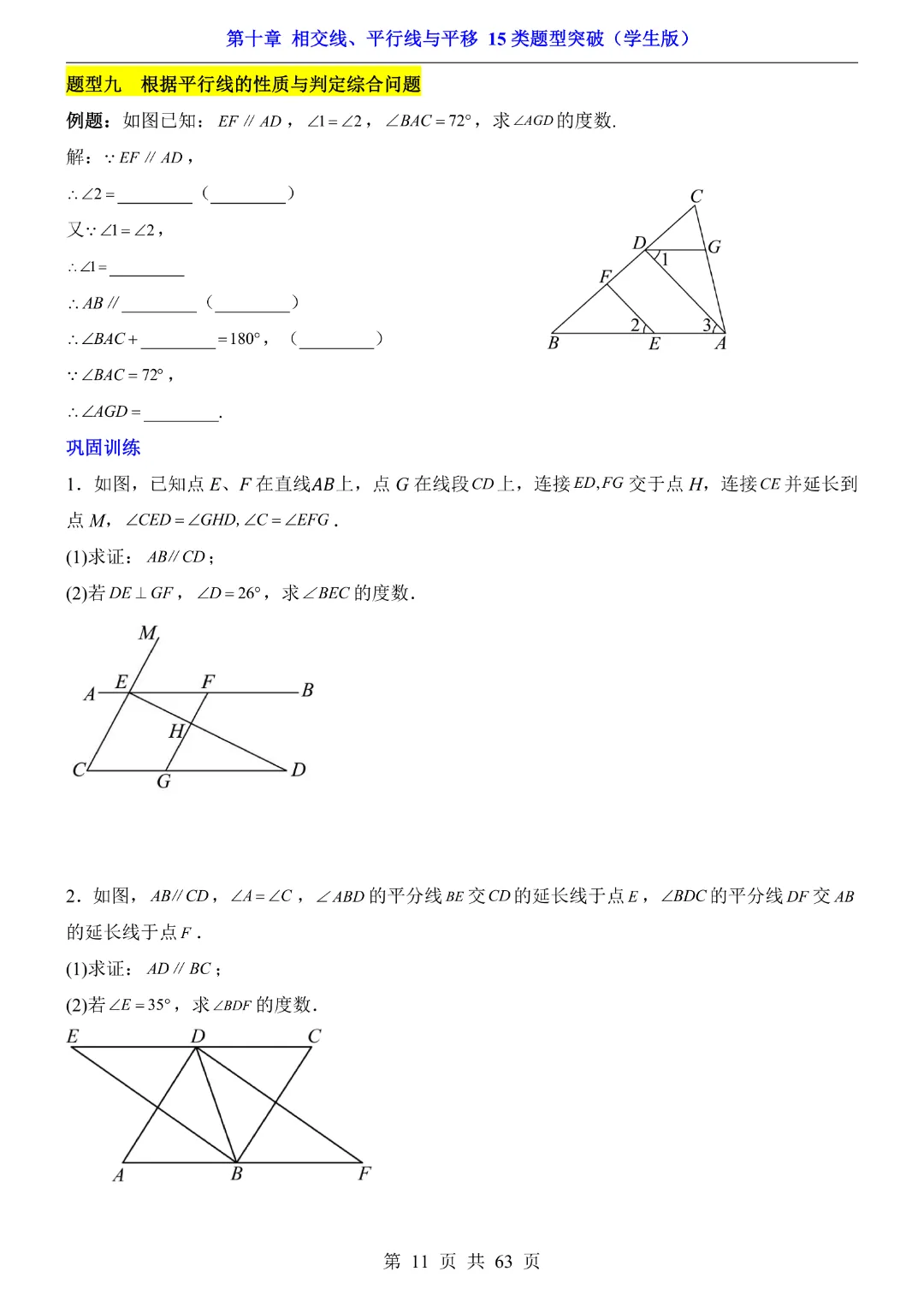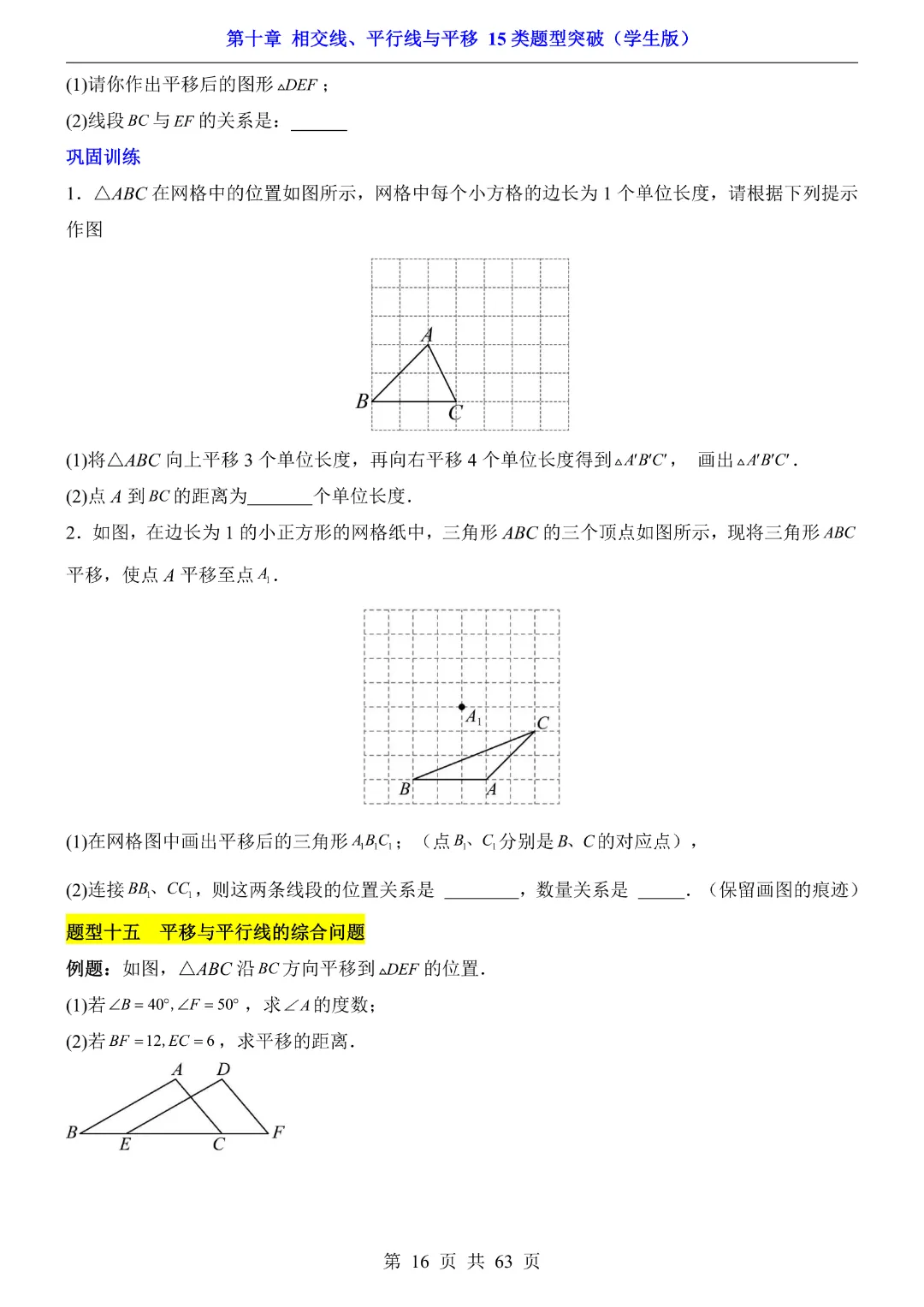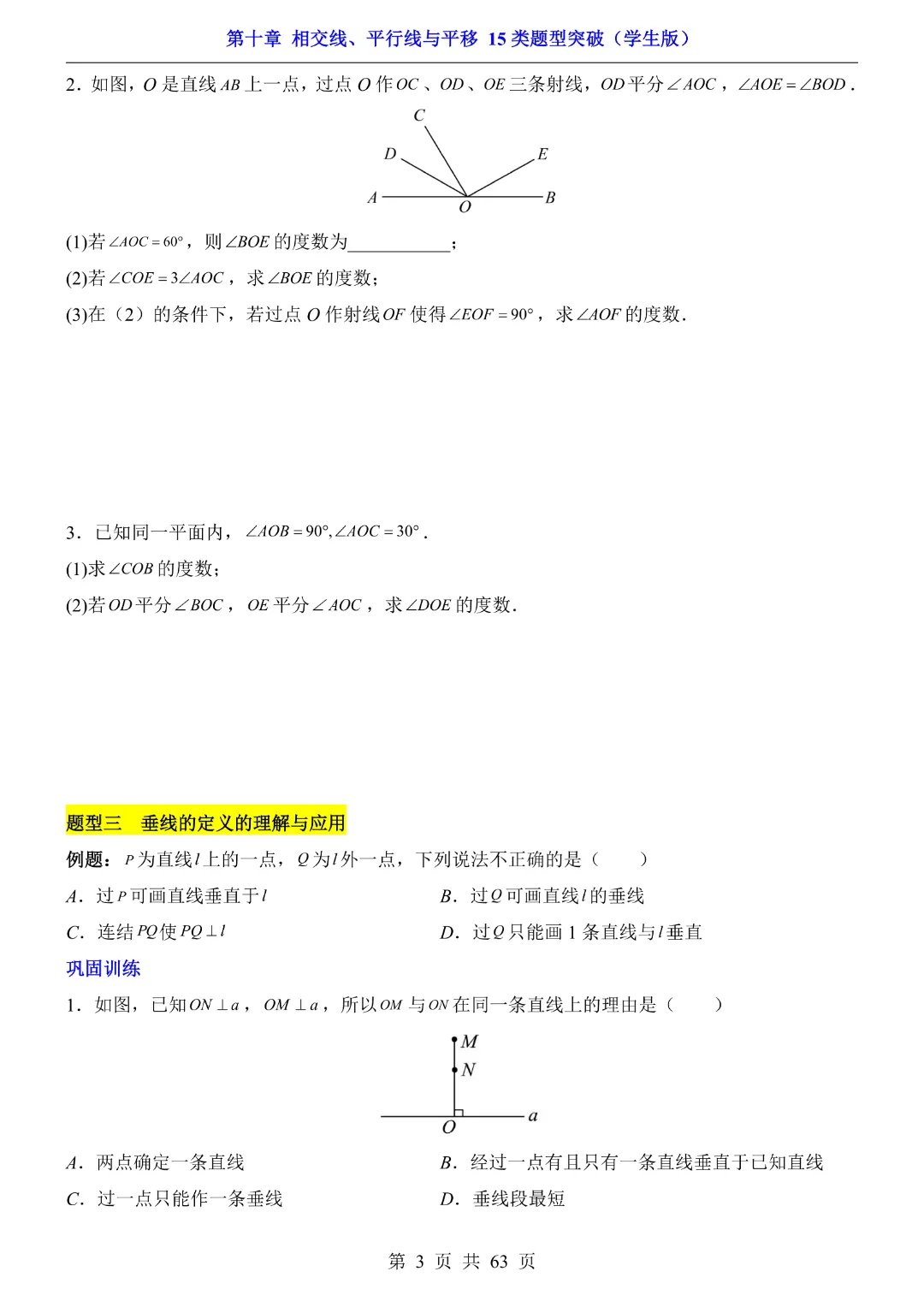 今天给大家分享的是:【七年级下册数学】【沪科版】第10章相交线、平行线与平移十五大类题型突破附带答案|完整高清电子版可打印
