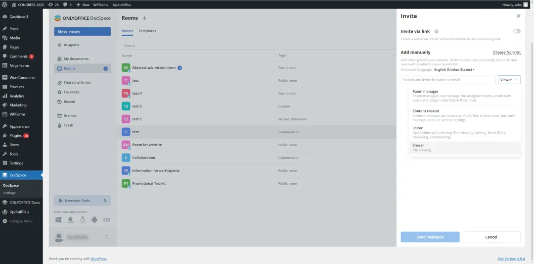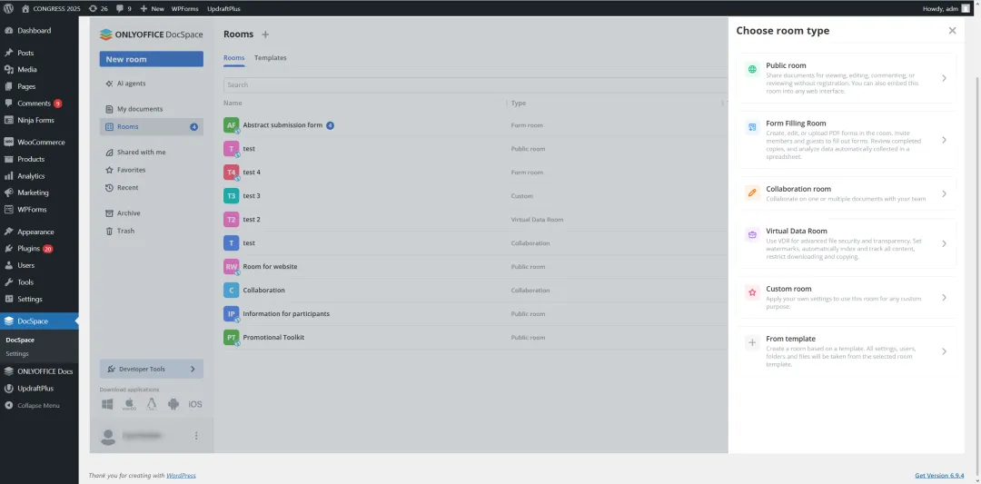 ONLYOFFICE 协作空间与 WordPress 的集成是希望超越基本文件共享的组织的智能解决方案。通过嵌入安全房间并能够通过 WordPress 直接进行实时文档处理,团队和企业可以简化沟通,提高生产力,并为内部和外部用户提供更好的体验。