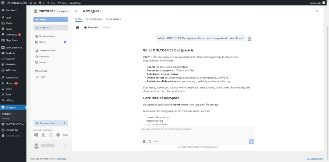 ONLYOFFICE 协作空间的核心功能之一是 AI 智能体的可用性。这一功能将智能助手的新水平直接带入您的日常 WordPress 任务,帮助您更快、更高效地工作。