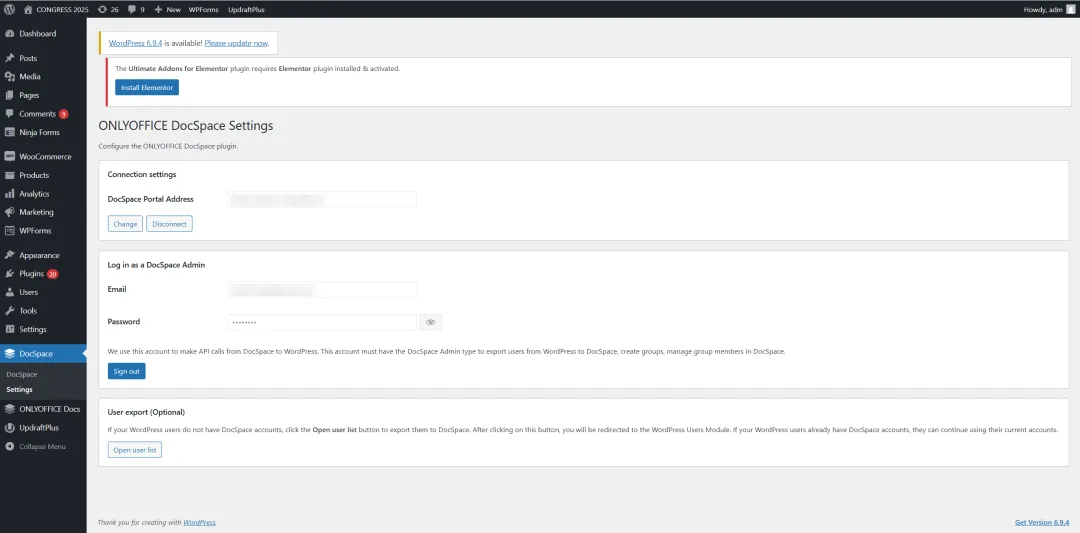 用于 WordPress 的 ONLYOFFICE 协作空间插件: