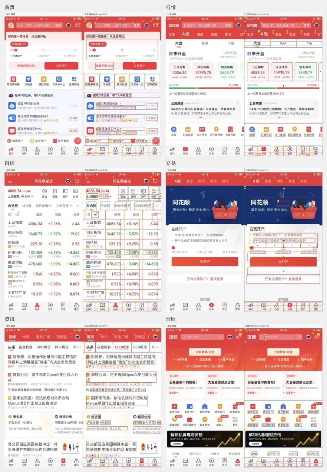 下面这张图,是 iOS MCP 对同花顺 App 多个页面获取 UI 节点后的效果。