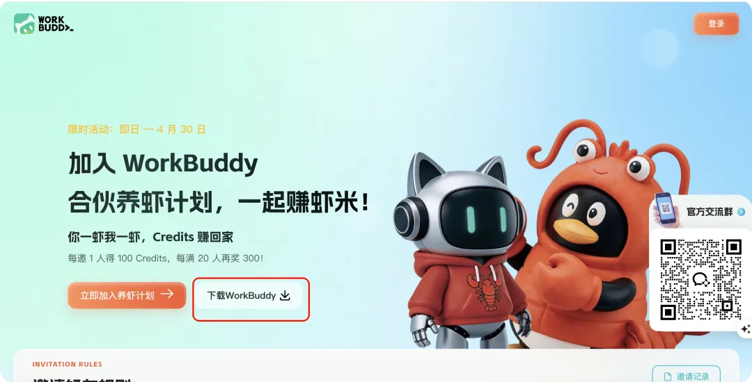 下载地址:打开 https://www.codebuddy.cn/fission/?inviteCode=18mjh46j91,务必下载WorkBuddy,不要下载codebuddy,根据电脑系统选择对应版本(Mac ARM64/Mac x64/Windows x64)。