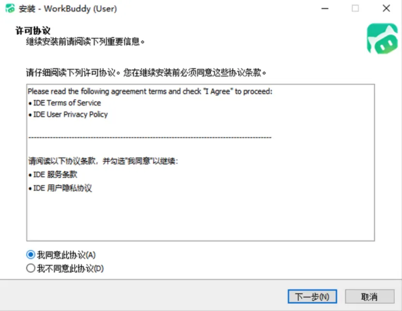 双击安装包运行,勾选我同意此协议,点击下一步。