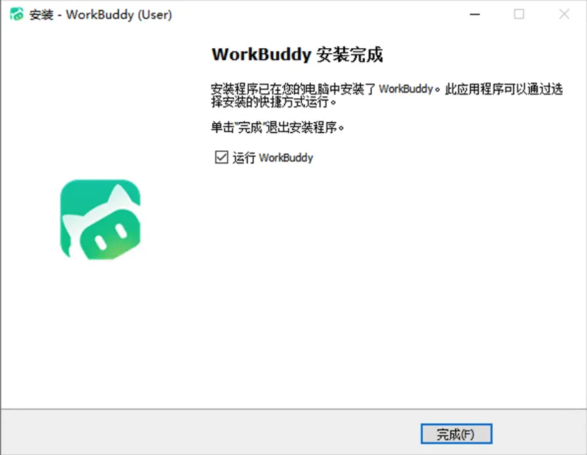 安装结束后,点击完成,自动运行WorkBuddy。
