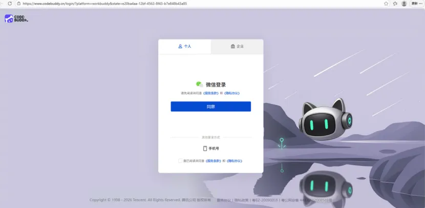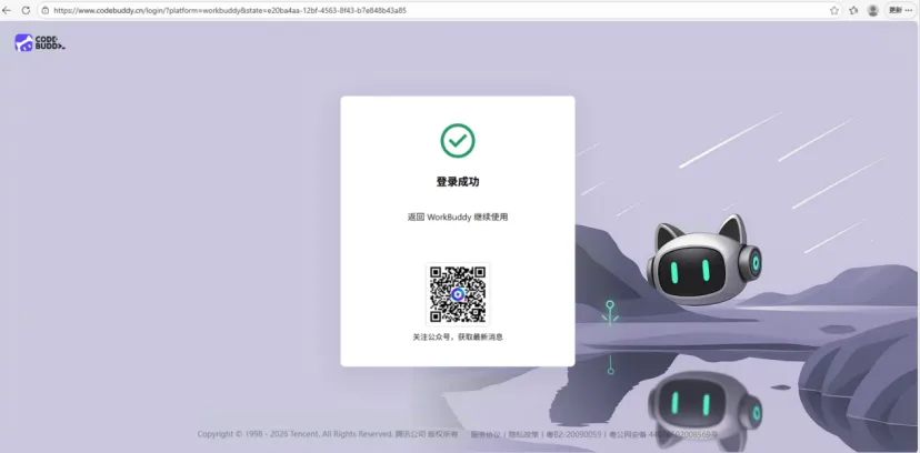 打开WorkBuddy后,点击登录,跳转浏览器登录页面。