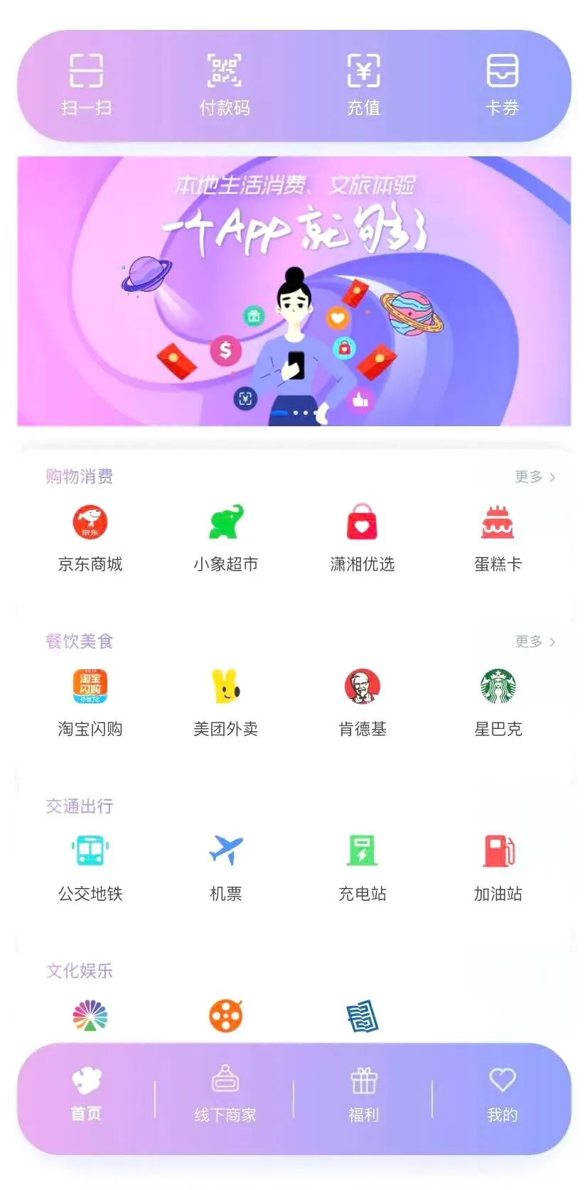 打开App,底部四个频道——“首页、线下商家、福利、我的”,清清爽爽。点进首页,七大板块整整齐齐:购物消费、餐饮美食、交通出行、文化娱乐、酒店住宿、生活服务、金融服务。