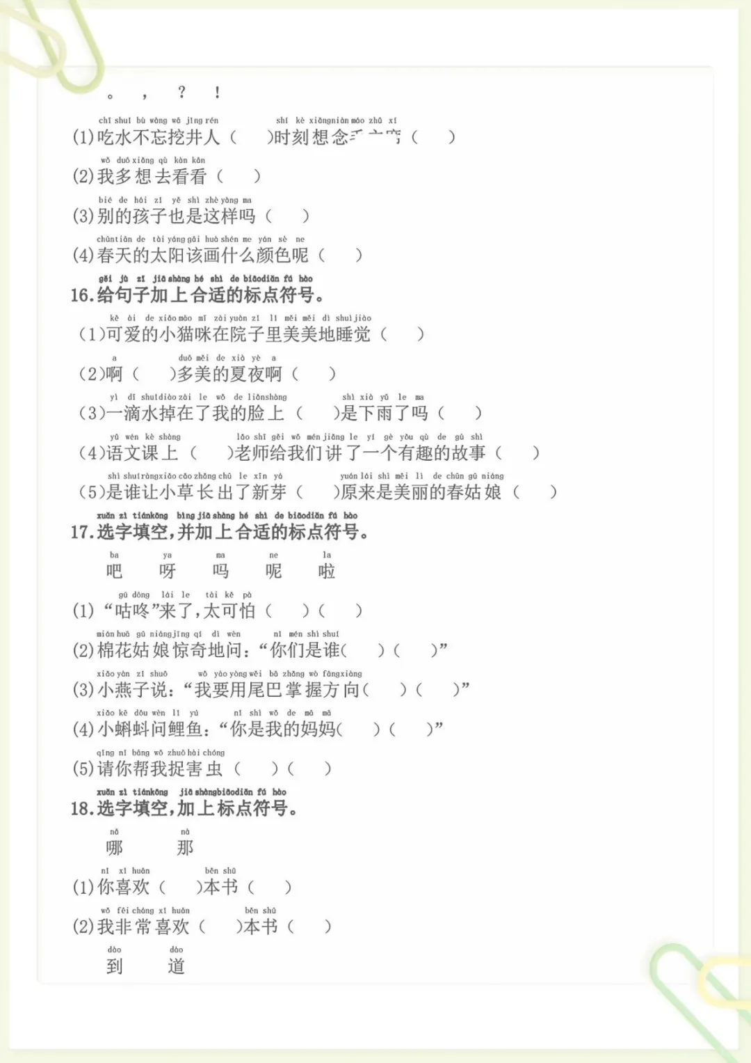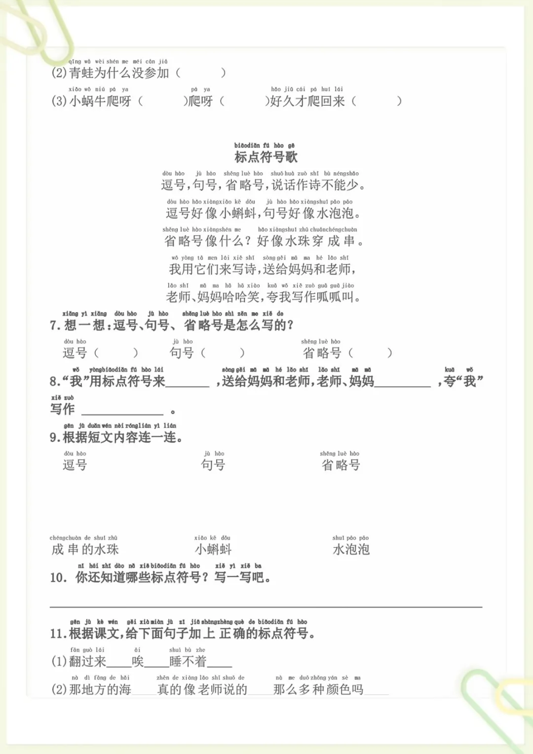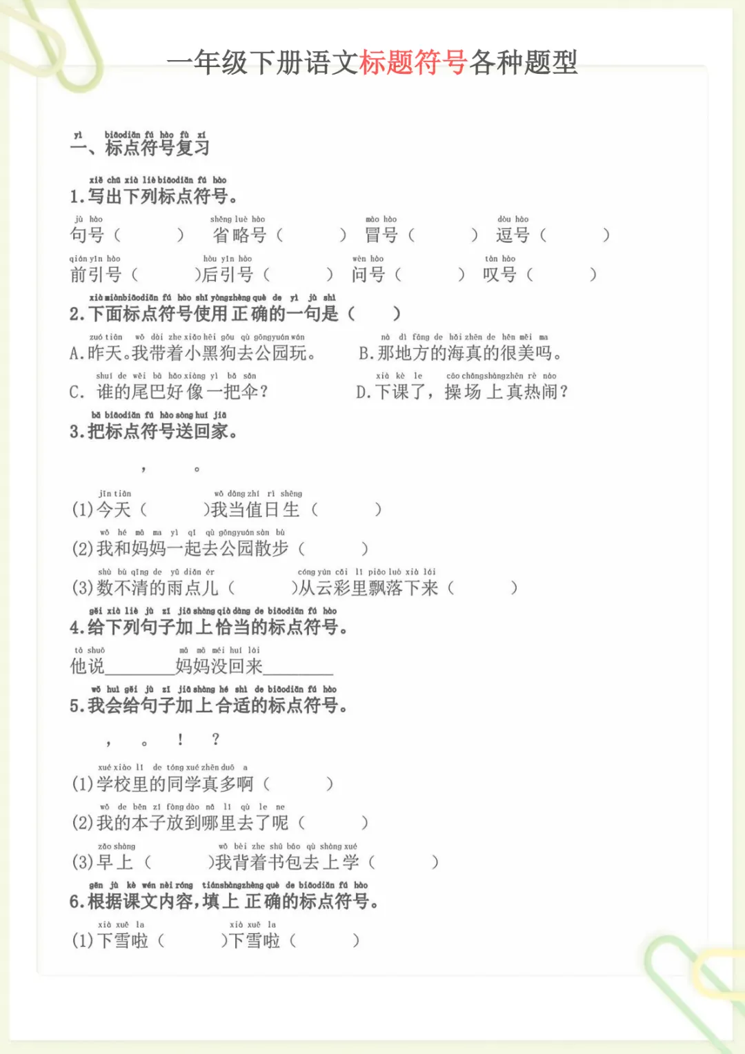 一年级下语文标题符号各种题型,共9页,电子版可下载可打印,这份专项练习围绕一年级下册语文中的标题符号运用展开,帮助孩子熟悉不同题型,巩固相关基础知识,进一步提升审题、辨析和规范书写能力,适合作为课后练习与专项强化使用。需要的家长可以及时下载打印出来,让孩子练一练,更扎实地掌握这部分内容。