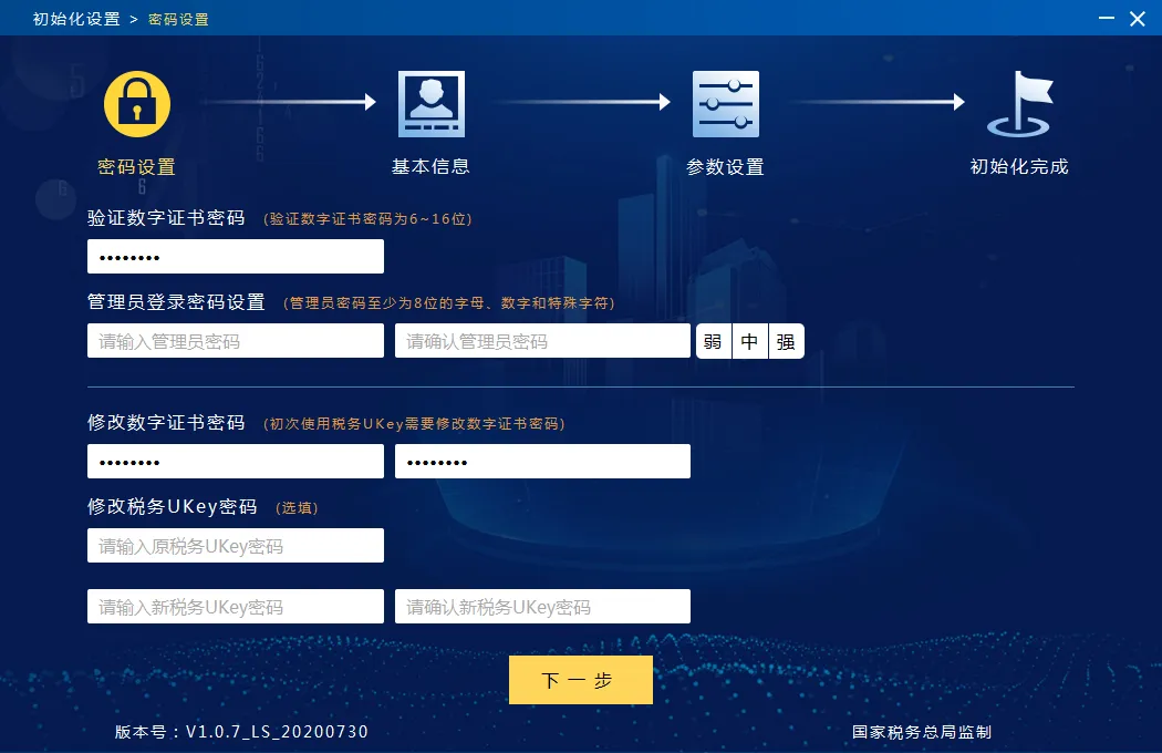 验证数字证书密码,管理员登录密码默认为空,可以在此处选择修改税务Ukey密码和管理员登录密码,也可以选择都不修改。首次使用税务Ukey需要修改数字证书密码,这里填写两次修改后的证书密码,点击“下一步”。如图1-2-2所示。