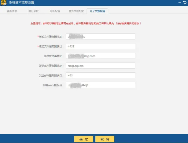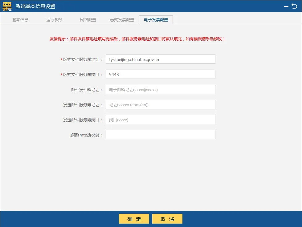 6.电子发票配置:首次开具增值税电子专用发票之前,需要正确设置电子发票配置,包括版式文件服务器地址、版式文件服务器端口、邮件发件箱和邮箱SMTP授权码。软件自动带出版式文件服务器地址,版式文件服务器端口,纳税人核实确认即可。如图1-6-1所示。