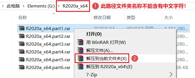 温馨提示:安装包有6个(大小共20G),均下载完成后才可以正常进行解压,找到R2020a_x64.part1.rar,鼠标右击选择解压到当前文件夹】,耐心等待解压完成即可,Part1~6自动同步进行解压,无需再单独解压。