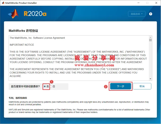 4.许可协议界面,先勾选“是”,然后点击【下一步】