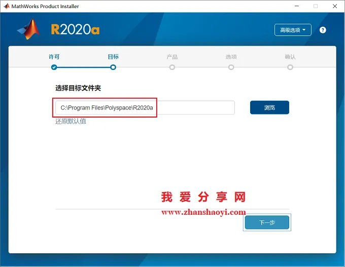7.选择软件安装路径,默认安装在C盘,因软件占用磁盘空间30G+,强烈建议点击【浏览】更改软件安装位置,注意:安装路径文件夹名称均不能含有中文字符!小编这里将软件安装在D盘MATLAB2020a文件夹下,设置好后点击【下一步】