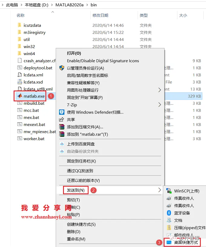 16.WIN10系统不自动生成桌面图标,依次打开D:\MATLAB2020a\bin文件夹,然后找到matalb.exe,鼠标右击选择【发送到】→【桌面快捷方式】生成桌面图标,方便以后打开软件