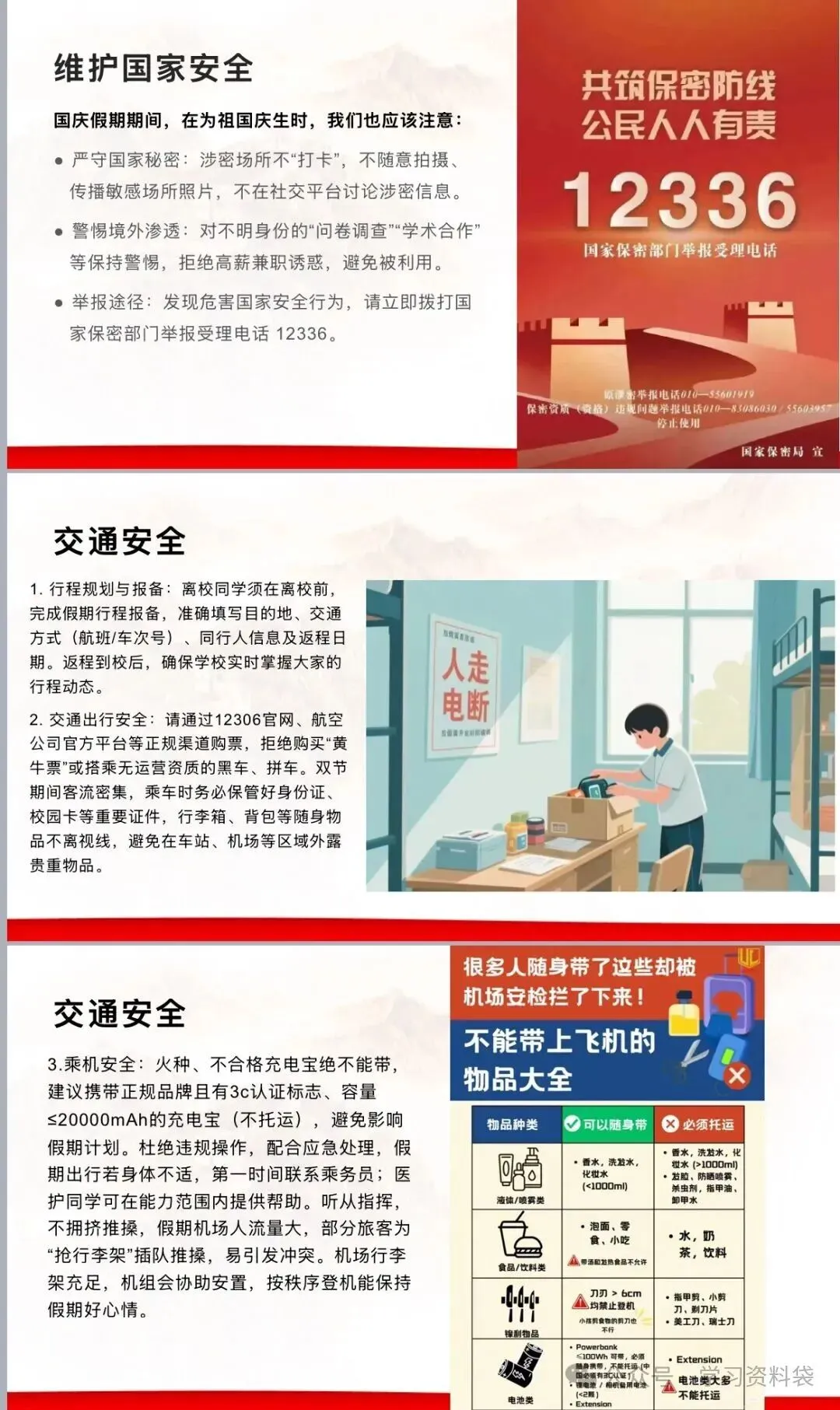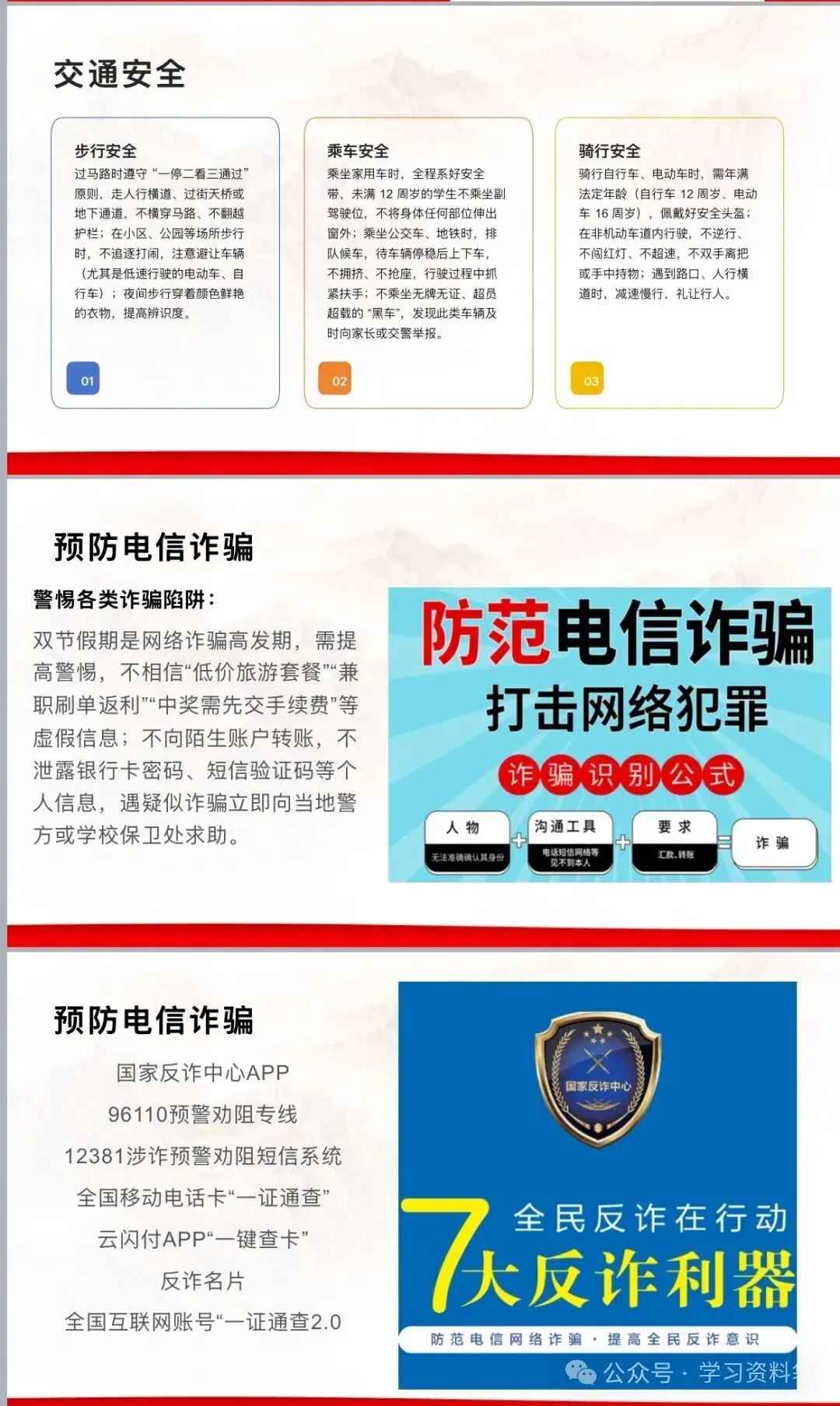PPT 围绕假期核心安全场景全面覆盖:从出行安全的行程报备、交通规范、乘机违禁品清单,到防范电信诈骗的实用技巧与反诈工具推荐;从游玩时的防踩踏、高风险项目规避,到居家用电、极端天气应对;更包含校园欺凌识别与自我保护等关键内容,逻辑清晰、重点突出。