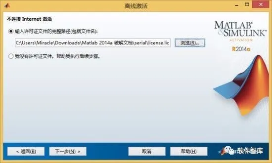 13.下面开始破解,把之前下载的Matlab2014a破解文件解压缩,点击【浏览】选择破解文件地址,分清楚你的操作系统是32位还是64位,别搞错了。