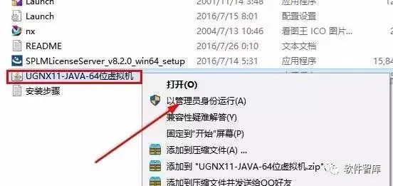 1.使用“百度云客户端”下载软件安装包,并解压缩。然后找到“UGNX11-JAVA-64位虚拟机.exe”,鼠标右击选择【以管理员身份运行】