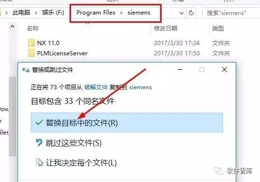 30.找到步骤23中安装的路径,我这里在步骤23中安装的路径是F,所以在F盘中找到:\Program Files\siemens\点击【粘贴】,选择“替换目标中的文件”