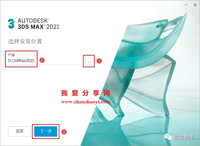 5.选择软件安装路径,默认安装在C盘,点击【…】按钮可更改软件安装路径,注意:安装路径文件夹名称不能出现中文字符!小编这里将软件安装在D盘3dMax2021文件夹下(需提前在D盘新建名为3dsMax2021的文件夹),然后点击【安装】