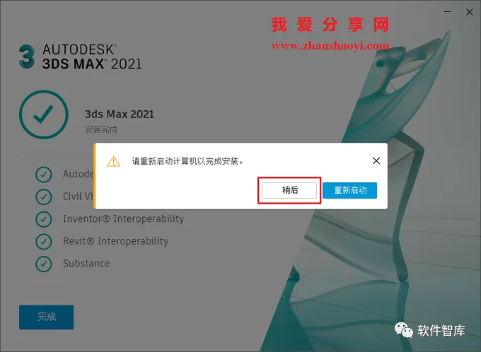 8.安装结束,提示需要重启计算机,点击【稍后】