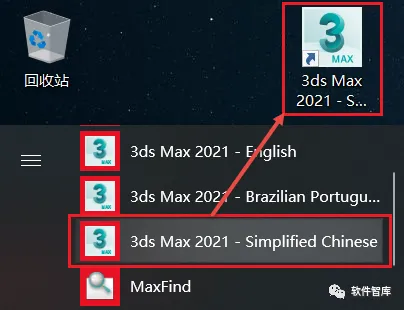13.点击左下角“开始”按钮在弹出的程序列表中找到3ds Max 2021 - Simplified Chinese快捷方式,鼠标左键按住不放直接拖拽至桌面生成图标,方便以后打开